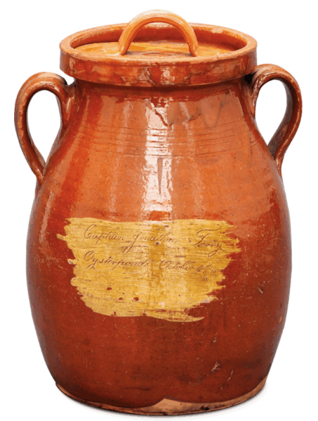 This important example of American earthenware pottery is inscribed: Captain Jonathan Terry / Oysterponds / October 6th 1800. It was likely made for Captain Terry on Eastern Long Island or in Connecticut and is very similar to one in the Winterthur Museum and Country Estate in Delaware, which has an inscribed date – extraordinarily – just one day later than the Oysterponds Pot. The Terry family has been on the North Fork since the earliest European settlement in the 17th century. This pot was given by Marian Edwards and her brother Irving Latham. Their mother was a Terry.