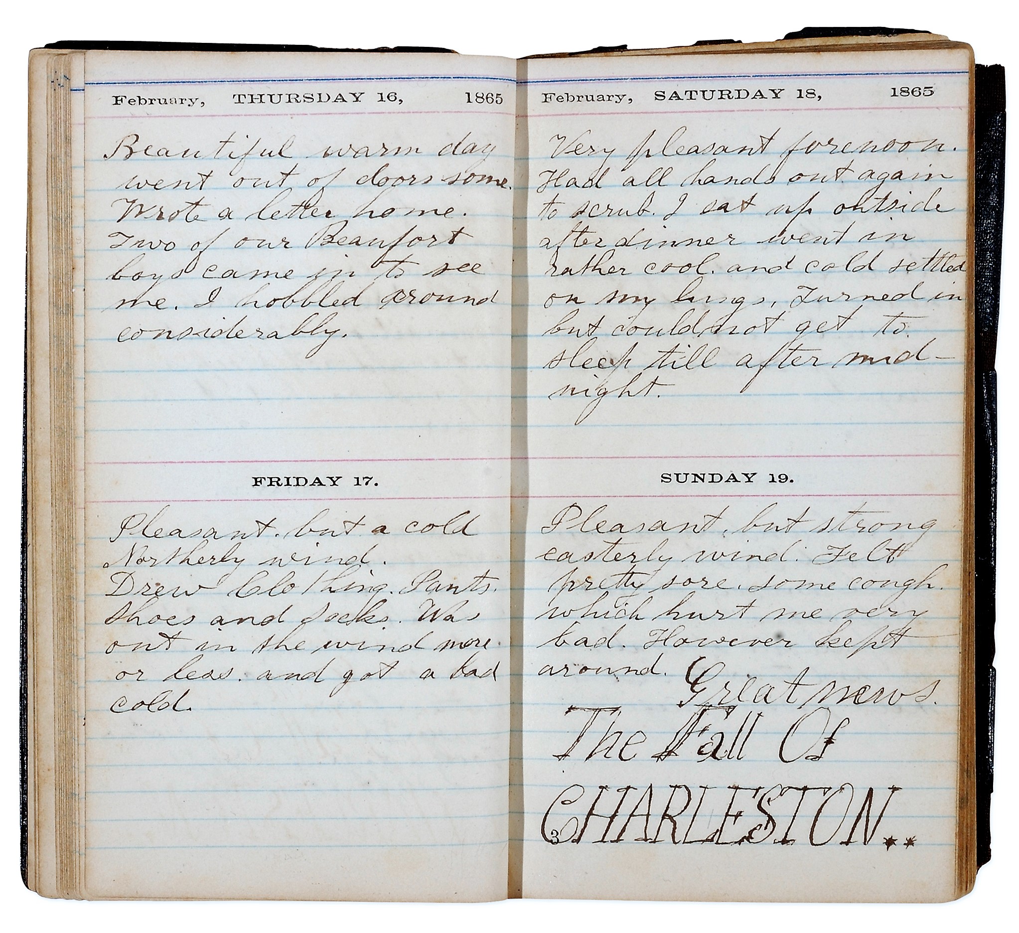 John Henry Young was born in Orient in 1840 and enlisted, as did so many young men from Orient and East Marion, as a Union soldier in the Civil War, serving with the 127th U.S. Volunteers. Although injured in the war, he survived and returned to Orient, where he became a farmer, living until 1921. His diaries were given to the OHS by Beverly Lomas. This volume for the year 1865 begins on January 1: “The new year which today begins its accustomed round finds me severely wounded in the Field-Hospital at Deveaux Neck. Cousin George [Latham] lies by my side also severely wounded.” His cousin died on January 12. On January 30: “A lot of Sherman’s men came to the Hospital.” Then, on February 19, a momentous event, written in large letters: “Great news. The Fall Of CHARLESTON..”